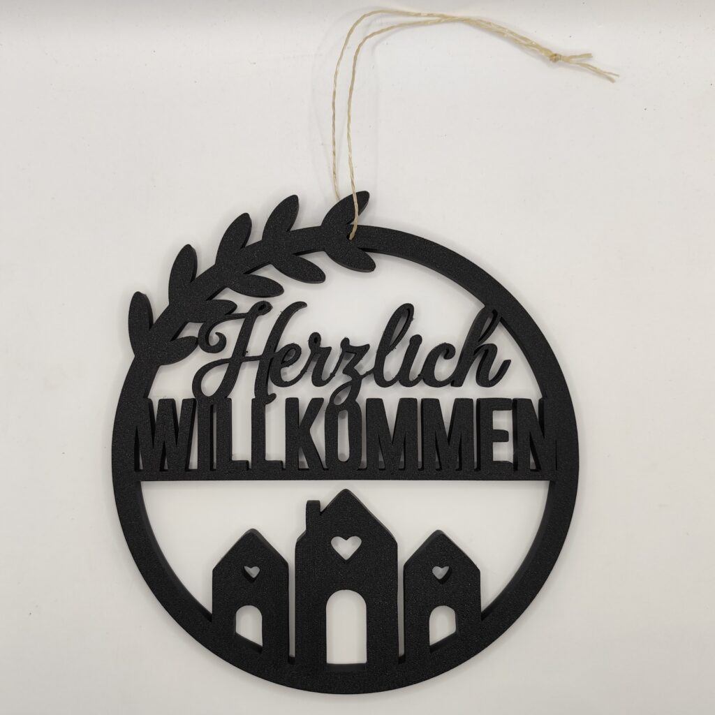 „Herzlich Willkommen“-Anhänger aus dem 3D-Drucker – dekorativ, zum Aufhängen, mit liebevollen Details.